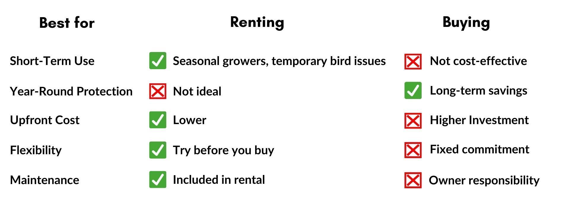Need bird control but not sure if you should rent or buy? Whether you own a vineyard, farm, or commercial property, choosing the right solution depends on how often you need it and your budget.